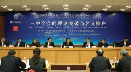 12月28日,社会保障国际论坛暨《中国养老金发展报告2014——向名义账户制转型》发布式在北京举行。财政部部长楼继伟、中国保监会副主席周延礼、中国社会保险学会会长王建伦、中国社会科学院副院长李培林出席论坛并致辞。